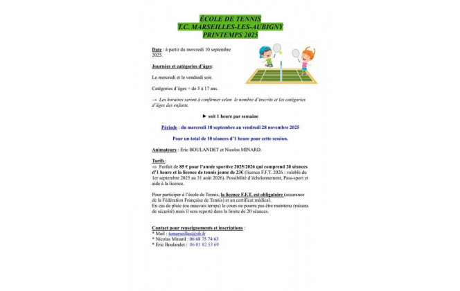L'assemblée générale du tennis club de Marseilles lès Aubigny se tiendra le 13 septembre 2025 à 16h00 à la Capitainerie (Halte Repos) de Marseilles lès Aubigny. Un hommage sera rendu à Alain. L'ordre du jour : - Bilan Moral - Bilan Financier - B...